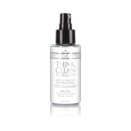 Think Clean Thoughts is a quick and simple-to-use anti-bacterial cleaning spray containing active anti-microbial ingredients proven to kill 99.9% of all bacteria and it is mild enough to not cause irritation to delicate tissue. Made with healthy ingredients such as: water witch hazel extract grape seed extract sweet orange and other true essential oils. Think Clean Thoughts is a better choice for cleaning pleasure products than standard bar hand and body soaps because it is oil-free and will not break down toy materials nor does it leave any residue that may be irritating to delicate tissue. Simple to use: spray directly onto pleasure products both prior to use and afterward. Wipe away extra fluid.